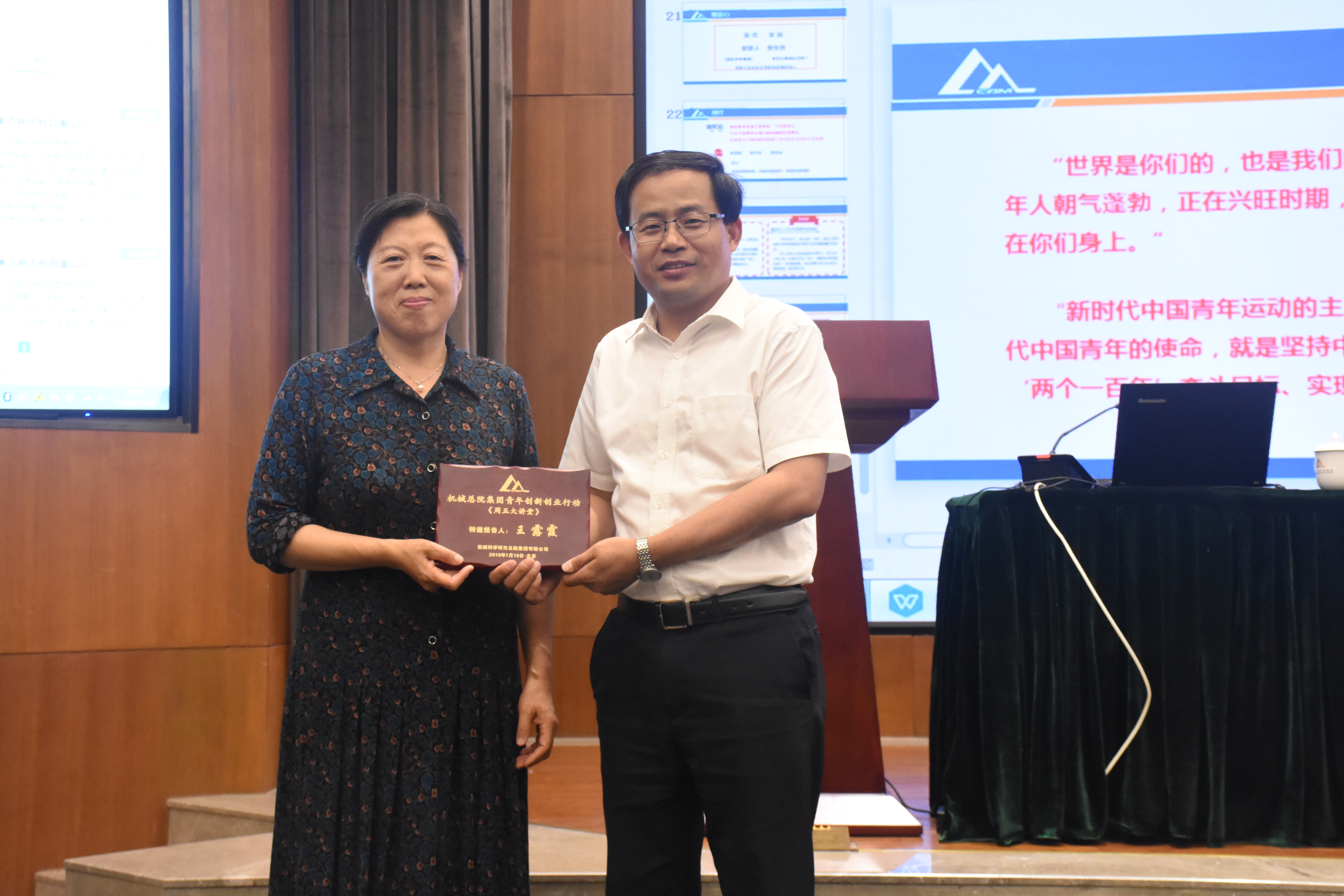 7月16日下午,人資部和機械總院集團團委共同舉辦了2019年第六期周五大講堂,本次講堂邀請到原機械總院黨委副書記、紀委書記、副院長王露霞同志,做題為“建功立業(yè)新時代”的主題講座,集團單忠德副總經(jīng)理主持并為王露霞老師頒發(fā)紀念獎牌,總院集團及在京各二級單位七十余名研究生、青年員工聆聽了本次報告。